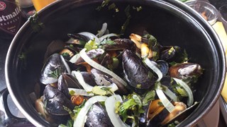 MOULES MARINIERES A LA CRÈME - Starter portion of mussels cooked in a white wine, garlic cream and herb sauce served with French bread
