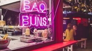 The bar has 8 draught beer lines of Double-Barrelled beer, a cider & guest beer line + cocktails, wines, spirits & soft drinks. The food traders are changed frequently. Simply order your food, they give you a buzzer to let you know when it's ready.
